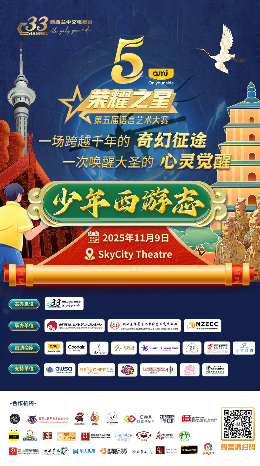 Auckland, 9 November 2025 — The grand finals of the 5th Stars of Glory Language Arts Competition, hosted by Channel 33 New Zealand Mandarin TV, were held at SkyCity Theatre in celebration of the channel’s fifth anniversary.